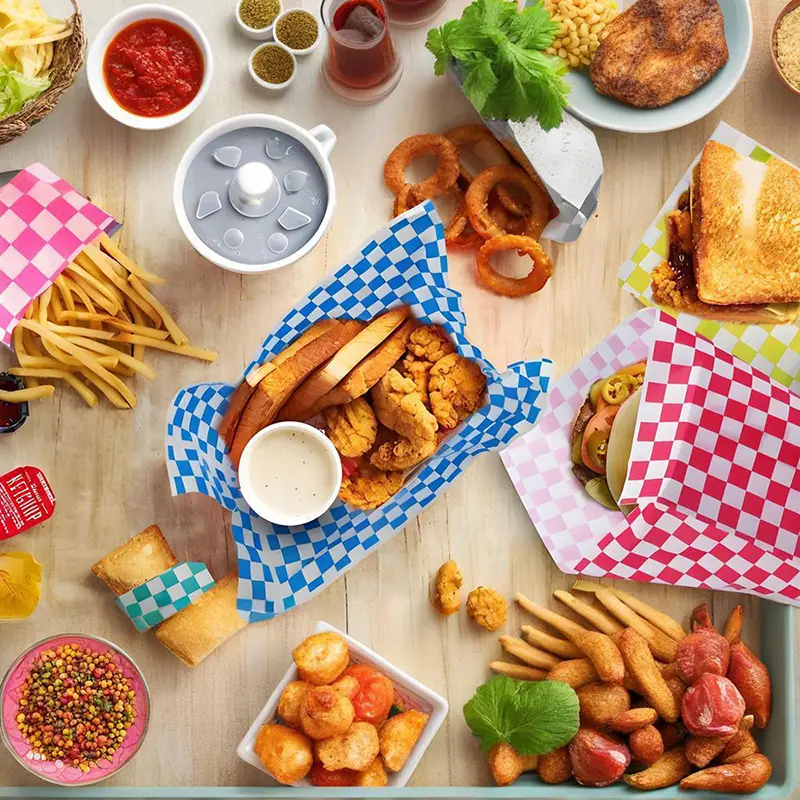 تنتج شركة NINGBO POWERR PLASTIC Products CO., Ltd. ورق همبرغر مقاس 38*28 سم على الطراز الأمريكي. ورق الهامبرغر الخاص بنا مقاوم للزيت والماء والالتصاق. يمكن للشركات والمستهلكين استخدامها لتغليف الهامبرغر والسندويشات والأطعمة المقلية والأطعمة المحمصة والفواكه والبسكويت والسلع المخبوزة وما إلى ذلك.
