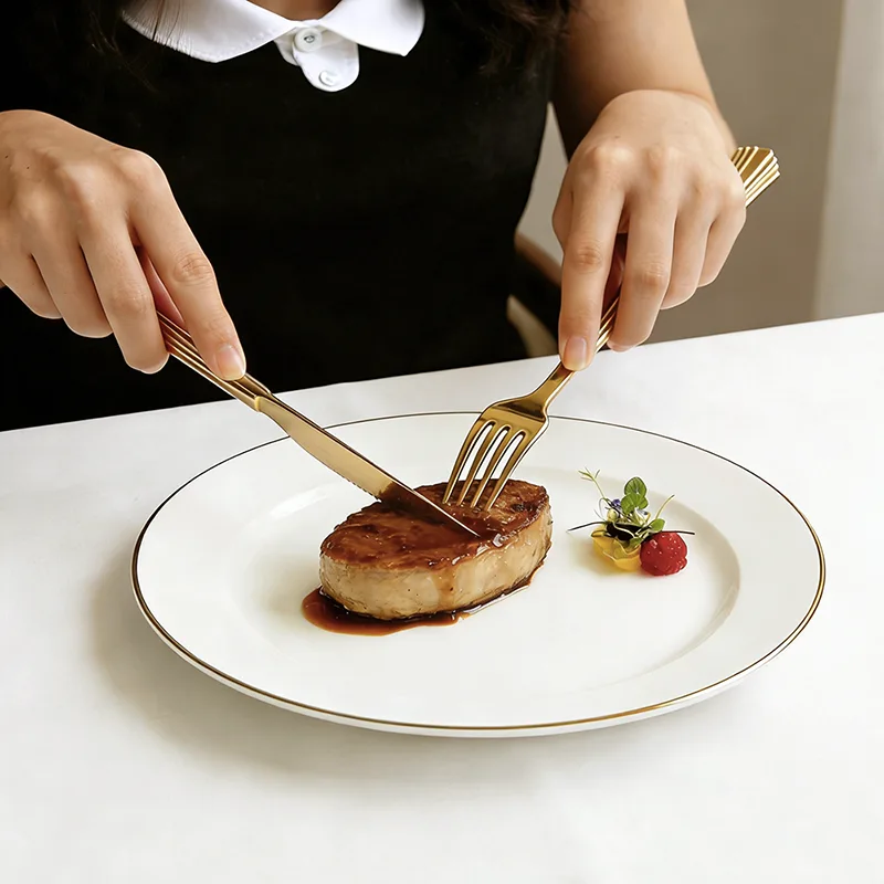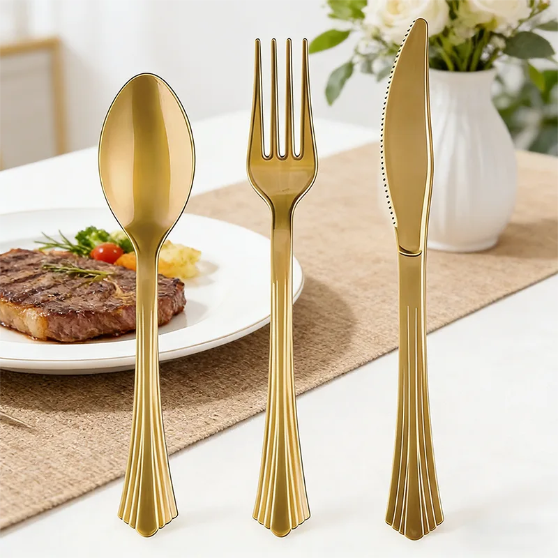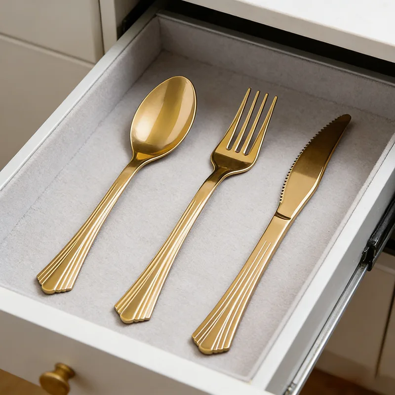 يغطي الطلاء الذهبي كل حافة بالتساوي، مما يسمح لأدوات المائدة بعكس الضوء الدقيق والتدرجات الداكنة تحت الضوء. إنها تمكن المادة البلاستيكية من تقديم ملمس جوهري مثل ملمس أدوات المائدة المعدنية، مما يقضي تمامًا على الشعور بالرخص.